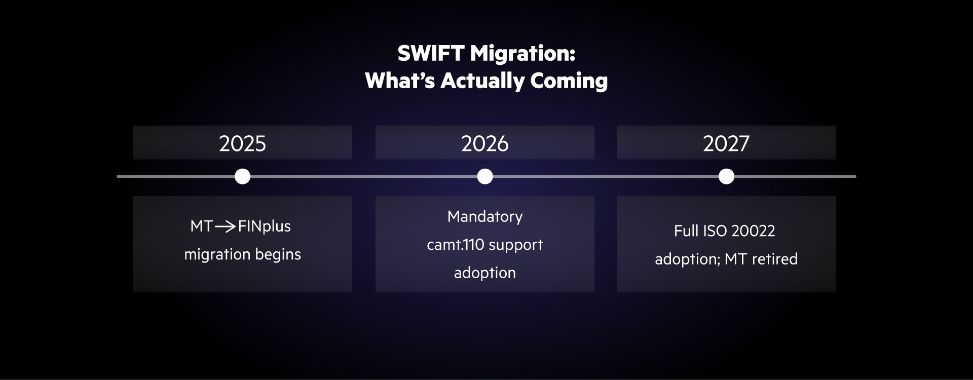 For those still transitioning, backward compatibility will be supported through embedded MT199 translations. This phase also introduces ISO 20022-native messages for Stop and Recall and Inbound Investigations, which are essential for fraud-related cancellation requests, and inbound case handling.